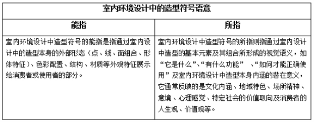 罗兰·巴尔特将符号定义为能指(signifiant)与所指(signifie)的结合(如同一页纸的正反两面),能指用于表达一个意思的符号本身,是表达层;所指就是能指所表达的意思,是内容层。就室内环境设计中的造型符号而言,也同样包含能指与所指两方面,而其所指也就是通常所说的‘室内环境设计中的造型符号语意’如下图所示: