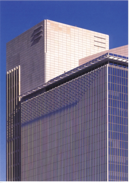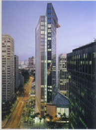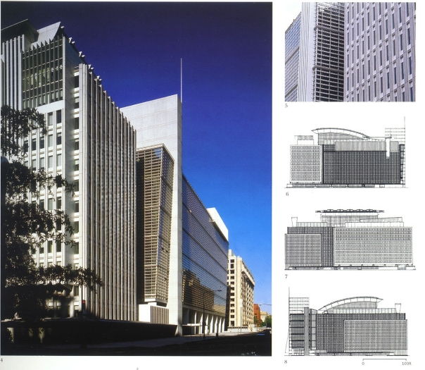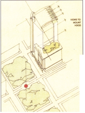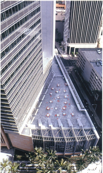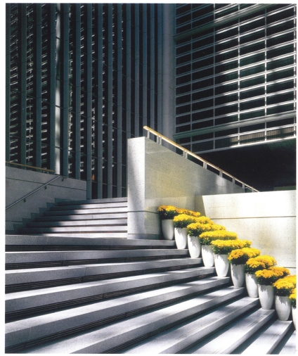 另外我们要注意的是在建筑表现的构图中运用对称法则要避免由于过分的绝对对称而产生单调、呆板的感觉,于是我们在整体对称的格局中加入一些不对称的元素,如画面中无续的人物、前景凌乱的植物投影、左右两侧的配景建筑和植物,这些不对称的元素不仅没有破坏整体构图的对称与严谨,反而能增加构图版面的生动性和美感,避免了单调和呆板。