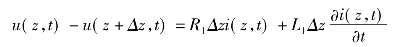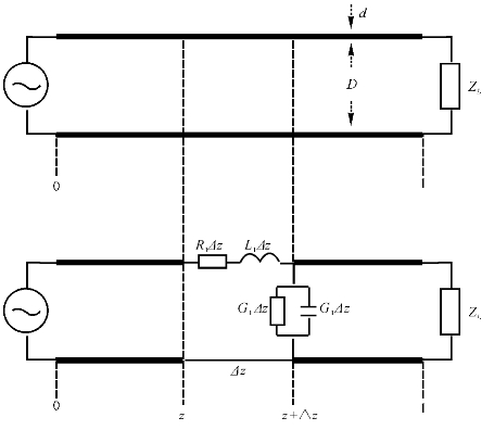 将坐标原点设在始端,在距原点z处取长度为Δz的线元,Δz远小于λ。该线元有如下参数,电感L1Δz、电容C1Δz、电阻R1Δz、电导G1Δz,其中L1、C1、R1、G1分别为单位长度的数值。