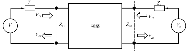 二端口S参数模型见图5-2。定义端口1为网络的输入口,端口2为网络的输出口。图中:V1和V2分别为端口1和端口2的信号源;Z1和Z2分别为信号源1和信号源2的特征阻抗;Z01和Z02分别为网络在端口1和端口2的特征阻抗;VI1和VR1分别为端口1的入射波电压和反射波电压;VI2和VR2分别为端口2的入射波电压和反射波电压;VI1、VR1、VI2、VR2的幅度均取有效值;T1和T2分别为端口1和端口2的参考面,入射波和反射波均以参考面为基准。
