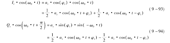 矢量调制原理框图见图9-11。首先生成IQ两路信号,然后I路信号与本振直接相乘,Q路信号与移相90°后的本振相乘,最后两路信号相加得到调制信号xt。下面是推导过程。