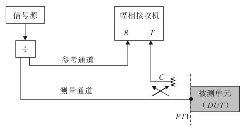 信号源输出的信号仍然被分成两路,一路直接注入幅相接收机的通道R,另一路经定向耦合器的直通端,即端口PT1注入被测单元的输入口,被测单元的反射波经定向耦合器C的耦合口注入幅相接收机的通道T。