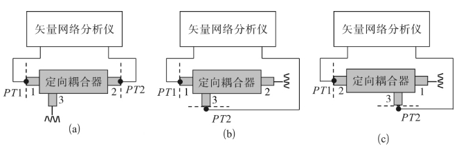(a)插入损耗测量框图;(b)耦合度测量框图;(c)隔离度测量框图