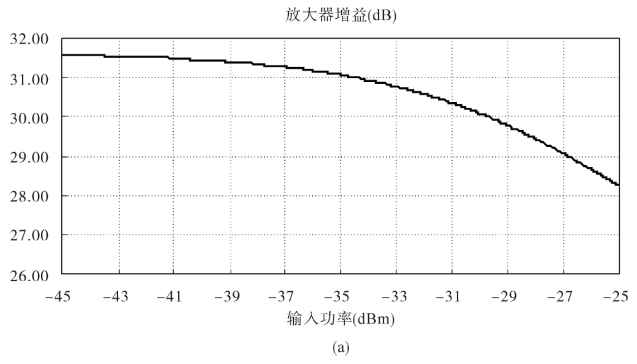 从图10-13a可以得到该放大器线性增益为31.58 dB,当输入功率为-32 dBm时,增益下降1 dB,为30.58 dB,此时输出功率为-1.42 dBm。该点即为放大器的1 dB压缩点。