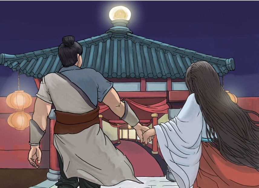 等阿大睁开眼睛看时,银光里,矗立起一座金色的宫殿,那夜明珠高高地嵌在屋顶的尖尖上。那姑娘和阿二,手拉着手,并肩走进宫殿,去成亲了。