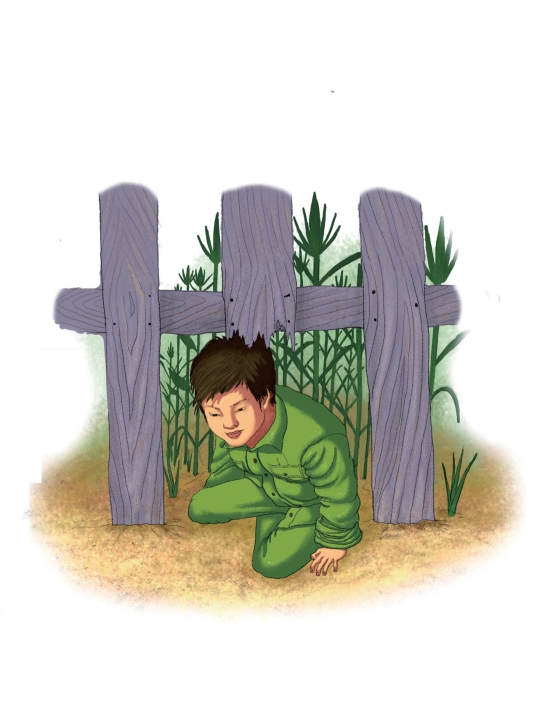 他趁老师和小朋友们都不注意的时候,偷偷从花园的篱笆缝隙里钻出去了。