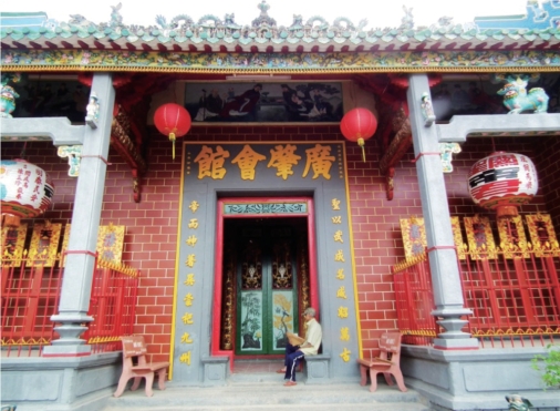 小船过桥转弯到湄公河河道便可看见胡志明的招手的雕像,河边即公园,是昨天我参观过的河楼旧址的延伸部分。出码头门进公园门,在林荫道慢慢散步舒缓坐船四小时的疲倦。从胡志明雕像后面进入小广场我注意到公园对面一个红门,挂着红灯笼夹在楼群里的中国风庙宇,信步走进门匾上大字写的广肇会馆。绕过入门处的影壁,正殿依次是香炉、条案、关羽关公圣像台,香火旺盛,台前有女香客跪拜。左侧两个窄厅,一间供奉观音,一间是中医诊室,八仙桌前一位中医大夫正在为病人把脉开方。另一侧供有土地、财神和王母娘娘神位。