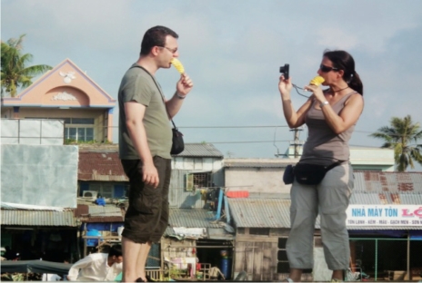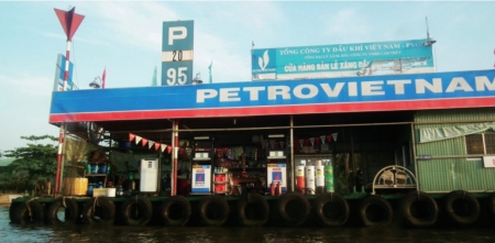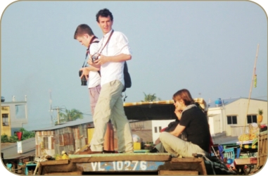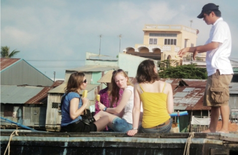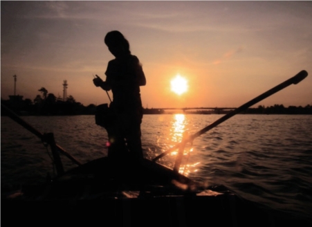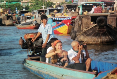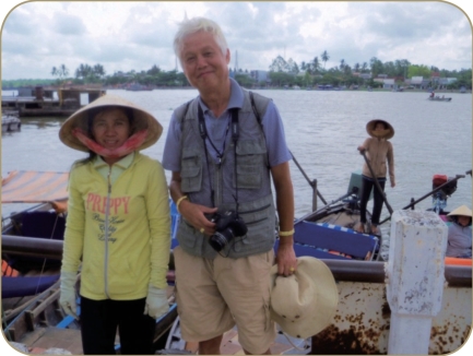 早晨5点半我站在巷口等接我的人。过了十分钟没动静,正思忖着不会被骗吧,身边一个女人说话吓我一跳,扭头看一个矮个、30岁上下妇女一脸笑容看着我说话,越南语我听不懂,她比划着意思是去屋里找不见人,来回转了几次才发现巷口站的人像是等人的。她拿出一张纸递给我看,是昨天我和那位“阿庆嫂”签的合同,有我的签名。双方核实好之后她带我穿过斜对面小巷到昨天下午我逛过的菜市场停满小船、货船的河边,那里十几二十条船尾带柴油机的小划艇在等候客人。她和河边的人,船上的人打着招呼,说笑中踩跨过几条小船,到后边小船上划桨挤进船堆里,划到岸边叫我上去。待我坐好,船娘慢慢摇浆,划出船堆到外边江上,停下船桨,拉绳,发动柴油机,在响亮清脆的轰鸣声中船尾喷出白烟泛起白浪加速驶入江心,顺流而下。
