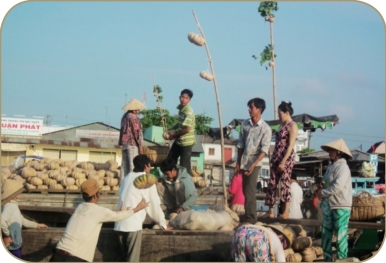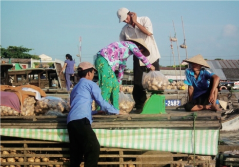 湄公河河道宽有二三百米,南岸大小码头自不必说,停满载货的、不载货的各种船只,中间一排大小货船未到河心,顺流一字排开长龙,越过河心,又有一排大小货船顺流一字排开长龙,距北岸约百米。三排货船长约百米,和中间两条河道组成交易区,买家船、观光游船和不同品类流动售货船穿梭两河道之间,买的买看的看卖的卖,交易区外约百米宽河道能同时给其它过路船只通行,各行其事,场面杂而不乱。