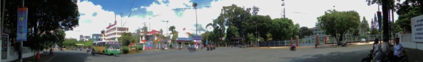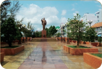 离开监狱博物馆(哦,应该是芹苴博物馆),紧挨着的大院里是座政府办公大楼,国旗飘扬,几多庄严。继续往前走到街口,能认出直对的大道是昨天下午走过一截的市内通衢,另外三个不同方向的路便不知向何处去了。街口的开阔视野和蓝天白云、花草碧树看过去非常享受,很像前几年从拉萨坐青藏线铁路出来,在格尔木街头享受到的那份远离嘈杂、宁静淡泊的感觉。