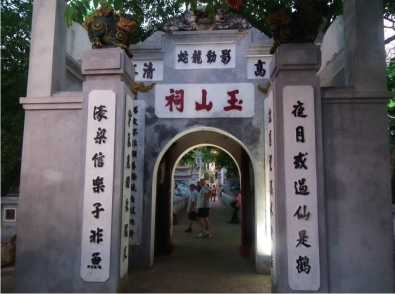 【百度还剑湖】Hoàn Kien 珥河支流淤塞为湖。南北狭长,呈椭圆形,面积12公顷,平均水深1.5米。1418年,黎朝太祖皇帝仗剑平定天下。十年后有金龟浮出水面收走游船中太祖剑,故名“还剑湖”。此前称绿水湖,与栖旭桥、玉山祠、笔塔等为河内第一名胜。