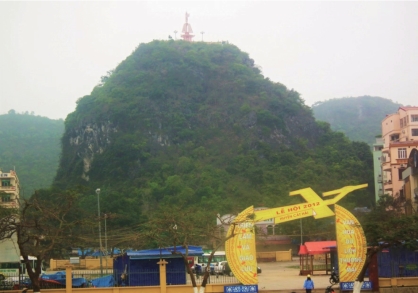 天已放亮,云层厚,估计又是个大阴天,太阳是看不到了,也好,少挨晒,水墨连环画继续看。农家起床早,几户门前有人开始晾晒玉米,大包粮食正从院子里扛出门。几家舞厅,卡拉OK屋和足浴室房子以及小商店小饭店修得很别致,像是经过精心设计后改建的农家屋,也意味着农民向城市生活商品社会的一种快速过渡。坡底是村庄民居和城市高楼的分界,中间大块空地可以仰望昨晚红灯闪亮的高高山顶,整个城市的制高点。我将长焦镜头当作望远镜,清晰地看到有座三足鼎立上中下三节构建的尖塔。询问路过的一位知识分子模样路人,他很热心地用纯熟英语介绍说,山顶最早是法国人建的一个气象站,北越独立以后抗击美国战争期间,成为人民军的防空警报站(昨晚我看过地图,吉婆岛在海防东面,是海防天然海上屏障。不论是从岘港等南方基地起飞的B52,还是从航空母舰起飞的舰载机,甚至更远的泰国南方飞来的轰炸机群,大多需从吉婆岛上空经过进入海防及内陆,这个制高点是最佳观测点和警报传播点),多次遭到过轰炸。战争结束后,上面修建为公园供市民登高观赏风景。从路边可以清晰看到登山的曲折陡直,攀爬石阶和鲜艳颜色的铁梯扶手。可惜时间有限,我没有尝试登上山尖一睹战争纪念公园,俯瞰这座美丽海港。谢过路人详细介绍,再往前走来到昨晚的灯光夜市和栈桥广场。夜色黑幕和五彩斑斓的灯光褪去,广场和栈桥周边一览无遗,眼前是海上群山环抱的巨大港湾,海面一边集中停放着上百艘蓝颜色船体的出海作业渔船,星罗棋布地点缀的小船和荡漾海面共起伏。吉婆岛这个海湾和昨天下龙湾的溶洞湾中心娱乐湾远不是一个量级,可以是一个集渔业、货运、客运和游览于一身的综合性海港。