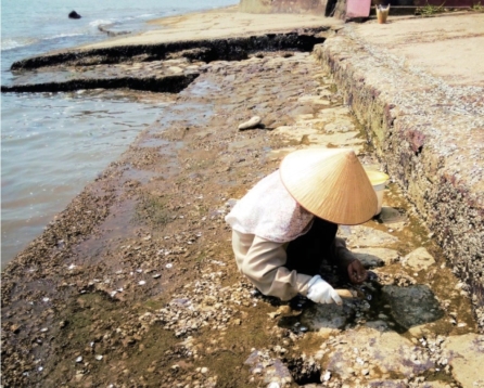健硕的黑牛奋力争斗,阳光下熠熠生辉,台基维护不力瓷砖脱落,周围环境有些脏乱,旁边是个农村式草屋咖啡馆,闲人打牌众人围观。斜对面大厦耸立,草坪椰树庭院典雅考究,保安在门口收放栏杆放行汽车出入,是个高档星级酒店后院。海边石堤两侧岸线展伸绵延望不到边。下石阶到水边,一块很大可做码头的的平台地面被坚硬的贝壳吸附变得坑坑洼洼走起来,硌脚。堤岸斜坡底有条约两米宽的小道可供行走。间隔很远两个妇女蹲在小道上挖着什么。走近前看,妇女手里拿的是一个弯曲带尖的小铲子,把吸附在坝石上的贝壳敲碎,用铲子尖挑出壳里的鲜肉放进旁边小盆里,已经放满一小盆。她俩低头专心致志挑蛤肉心无旁骛,自始至终没抬过一下头。挑拣出的贝壳肉或者拿去市场出售换钱,或者带回家改善生活给老人孩子增加营养,渔家妇女的辛劳吃苦令人感动钦佩。
