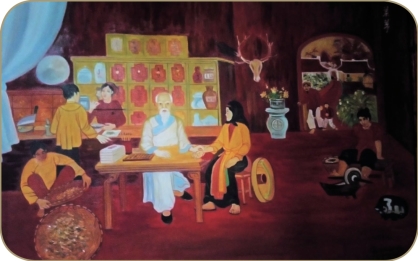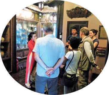 展厅面积不大,约四五十平米,各层相同。三楼实物展中多为药物加工称量器具用品,滚刀、切刀、药碾、石臼、木杵、戥子等等,石臼摏、杵切刀、滚刀、碾子到后期精工细作包装售卖,传统手工制作的大小器皿工具无所不包。下楼梯到二楼时讲解员正在用法语给先我进来参观的一群外国游客(散客)介绍展品内容,坐在楼梯间等他们下去我再进入展厅。二楼是本国医药专展,越南古传医学历史年鉴镶镜框里介绍历代医家,南药圣祠玻璃展柜中专著很多,润德堂牌匾下老式药店坐堂医旧貌重现,有越南本草挂图,多种药壶、药罐、碳炉及加工作坊实物列展。一楼三个分室,外边靠窗靠门的条桌旁一干观众在听导游小姐介绍茶道,挨个儿给各位斟茶品尝,听不懂说的法语,但我知道肯定在推销他们的成药制品和诸如参茸类的高档滋补药。里间是现代越南药厂出品的各种包装成药展销柜,越南文字读不懂,从外包装可以看出类似于我们国内的六味地黄、十全大补人参养荣之类中成药,丸散膏丹,多种形式,包装精美。看完一圈我穿接待厅往外走,茶道小姐走出来招呼我进去喝茶,带我上楼的小姐也过来问我是不是买点药给家里人带回去,我和她们开玩笑说,真是可惜,你们的医书我带不走,想买一本你们又没有,很遗憾,只好再见了。两位小姐礼送到门口。到街对面拍最后一张照片时,喝茶的客人们正在展柜前观看挑选,一对老外情侣牵手走出大门。中国传统医学在越南叫做东医,但是始终没有看到一本像韩国《东医宝鉴》那样的越南医学专著,除了那本《珠玉格言》。
