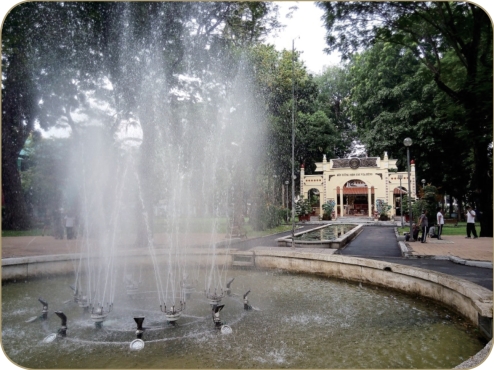 过喷水带,穿马路到对面进入游艺园,曲径草坪边各种抽象造型石刻像,一个露天演出舞台,棋艺室、咖啡馆、牌房外人多多,篮球场上教练在给一群女孩子做战术训练。这一带我眼生,三年前没有走过。穿出对向大门,路两边一侧是体育用品商业区,一侧是高墙大院,不见统一宫,而导航线显示已走到尽头,到了统一宫。徘徊几步观望,三五成群的老外和学生沿围墙边人行道经过,像是参观完毕出场的游人。我问街旁开着车窗读报的面包车司机,统一宫怎么走?举起手机伸到窗前,他放下报抬眼,一把抓住我手往里面拉,没回答我问题,扭头朝后望了望,说要小心。我明白他是担心身后飞车党抢包抢手机,谢谢他又问了一遍,他指指前面说前边左转就到了。问我是日本人?我说中国。他说你们外国人要注意,手机放在口袋里(他指着自己的上衣口袋),西贡摩托抢人很多的。谢谢他往前走。我猜他是给外国人开包车的司机,成天混在外国人堆里,英语流利得很,说不定还会点儿法语、日语、韩文什么的,西贡、河内、吉隆坡、雅加达这样的人很多很多。好心人多,也有坑人的,三年前河内旅行社美女职员大包大揽骗了我15美元,去年吉隆坡火车站中心广场那个旅行社华人女司机一公里路讹了我25美元。