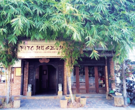 顶楼有个露天小平台,低沿漫土中间和墙边各种一株树,屋边围栏搭了些边墙树垂下的棕榈叶,土面满是首乌叶和藤,间或几棵车前草散在藤叶里,中间岔开两枝干的树不知名,想必也是棵药用之株,不然布展者不会在如此局促狭窄的空间里独留下它空中生长。这种独具匠心的精心设计安排给人一个道理:传统医学医药一体不分家。展厅里一本印有神农氏和越南医祖懒翁画像的“东方医药业团条例及内规”的老书上,画像两边写有“神农尝百草医药始有方”,文字说明了这个道理。博物馆小楼夹在周围诸多民居小楼中间,建筑外观毫无差别。如果不是作为传统医学博物馆,可以是街市住户中一个殷实人家的安乐窝。