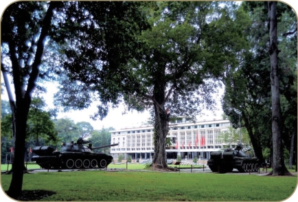 旅行团已经退尽,余下的游客不再拥挤。不知不觉间我在里面已有两个多小时,门前售票处可能已经停止售票,上午参观结束,没有新游客再进入。院子里人员稀疏,大多是往门外方向走正中院门出去离开统一宫。我下楼出大门去看左边林地里的坦克和战斗机,正所谓“硝烟散尽遗物在”,两辆坦克虎视眈眈,炮口对准“伪总统府”大楼随时待命开火,保持着当年进攻者的高压姿态。展览大厅里有一张当年攻入“伪总统府”的第一辆越南人民军坦克驾驶四成员展开国旗、军旗的合影照片。坦克身后林子边一架外观完整,漆色很新的美国战斗机,几个西方人围着转来转去拍照片后离去。有一对后来的夫妇,男士看得相当专注,连标牌小字都凑到跟前仔细看,我猜是不是当年飞行员后代回来看父辈的战斗历史了?和到云南高黎贡山查找驼峰航线失踪飞机遗骸的那些美国飞行员家属那样。不过两场战争的性质可是完全不同的。