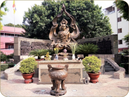 街角一块园林树荫茂密,鲜花绿草,高台上一个僧人塑像端坐,香炉飘烟,条案上花枝供奉。哪方圣僧有如此尊贵受人日日崇敬?目视礼拜,下台阶注意到有石牌文字介绍,再次感叹不识越南文,没文化的痛苦,继续赶路。谁呀这是?脑子里翻电影。可会是古时游方高僧传道有功如达摩、唐玄奘者?其装其貌不像,达摩在哪儿的形象都是大胡子高颧骨,越南庙中的唐玄奘一律袈裟、僧帽、正装,其他古僧则一概没印象。不是古来者,近代能是何人?记得当年听广播看报纸有僧人参加示威游行,也记得越南英雄阮文追,三年前战争博物馆里各有照片。僧侣反抗最剧烈者是自焚的……何人何名?