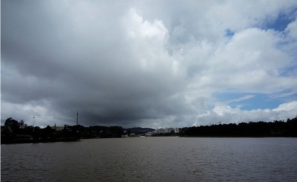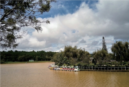 湖端区过后,滨岸除了树就是绿草,再无它物。才下过雨,草地积水,时有泥泞,贴近湖边石砌窄边,临池依水,清风夹带潮润空气拂面钻入鼻孔,浑身的爽利不知用什么词才能形容得出来。湖岸逐年修竣,有碑志记载。几支间隔很远的细长平台深入湖水十几米,有年轻人在那里拍照,野餐。也许还早吧,湖岸步行者寥寥。湖边路另一侧是个高尔夫球场,铁丝密网,林木掩映,看不到其中景物。走到湖另一端,转弯回绕处围挡隔板里正在紧张施工,湖的延伸部分不得见全貌。尽头左岸有一处花山公园,旅游大巴走下的游客在导游小旗引导下入内参观。见惯了昆明花卉,我没进去游览,一样的气候,比起昆明的国际范儿花都,大叻不在一个量级。就像春香湖和滇池面积,那样无可比拟。再前行,绕湖的叽叽喳喳的中国女孩儿和独步外国的MM相遇数次。湖的又一端望城,黑云压顶,万千风光。岸边小山坡上散建的亭阁和树木密丛中法式尖顶小楼别有风情。作为城市景观,环春香湖值得一走。