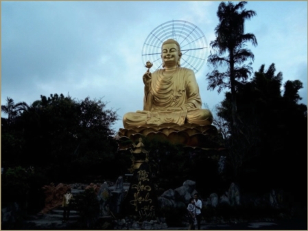 宾馆大堂一面墙挂满了大叻各个景区的巨幅照片。午睡一觉起床我到大堂叫总台值班服务员把大佛和一处瀑布小桥的名字写给我,根据名字在谷歌地图搜寻定位,确定距离和线路。经查大佛在西北方向约6公里,不是腿力所及;瀑布名khu Du Lich thac Camly,正东方向约1.6公里。按照先远后近原则,大佛安排立即去,明天步行走1.6公里游览瀑布。在市场旁请一位摩的师傅载我去。他从早上我去过的天主教堂方向走,穿城而过,约20分钟抵达。大佛寺位于一个山坡上,地势较高,可以俯瞰坡下农田果园。金身大佛高高在上,俯视大叻百姓城郭市井生活,香客信众燃香礼拜,奉花敬献,祈求佛祖保佑他们人生平安,合家幸福。和越南其它地方的庙宇一样,没有中国院寺对称布分、主次分明的完整建筑格局,而是依据地势错落建盖。大佛周边有一小莲花池佛像群,一众香客在菩萨带领下簇拥跪拜在佛祖身边。大佛侧殿内一尊金身卧佛安和慈祥,不远一尊紫木巨身弥勒佛笑口常开。大佛身后有座正殿,内有佛祖坐像和千手观音等诸神供奉。傍晚时分,香客依然陆续进殿敬拜祈福,供桌香炉前香烟缭绕。殿内时有钟鸣。一辆旅游大巴下车几十位游客,香堂一阵混杂,但并无喧哗零乱。游客看过之后拥在大佛前照相留影或到坡边俯瞰村野暮色,稍后在导游招呼下开车离去,是越南国内旅行团。大佛前勒石金字“Thien Vien Van Hanh DaLat”,后来粗略翻译为:大叻Van Hanh庙。