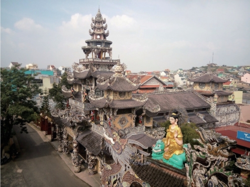 摩托车速飞快,小风一吹也没有了炎热。七曲八拐过不少街区,我想大叻其实也不小啊,只是我步行的范围小而已。感觉骑了很长时间似的,进入一个窄街口。闪过的牌坊上写有“霊福寺”,过了好一段路我才反应过来是个“灵”字繁写体。午后的高峰期吧,霊福寺里十几辆大巴把停车场挤得满满当当,满院子老外东游西逛叽里呱啦。司机送我进院子推车去存车处,我在院子里活动下有点僵的腿脚,他过来指给我看他等候的位置,我拉他自拍杆合了个影,便自己去看庙。