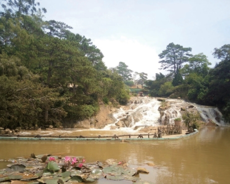 翻看网上信息,“khu Du Lich thac Camly”被译作“卡姆里瀑布旅游区”或“度假村”,大堂墙壁挂的图背景小桥激流,西方中年妇女招手微笑,看上去画面很美。是昨天下午确定的1.6公里步行线路,小半天游程。出行前我问值班服务生,墙上另一幅西方年轻人水中攀岩的照片是哪里?他写给我“Datanla”,GPS定位结果在城南6公里,需搭车前往,午后事。