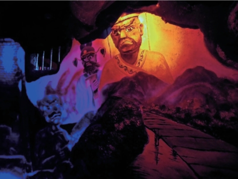 大殿边是僧院商店,里面长条桌案,各式实木家具厚重结实,甚至有整支象牙雕刻艺术品展示。侧面殿堂一众老年僧侣坐禅,逼真如活体。最里面墙角是道“鬼门关”,牛头马面两个小鬼把门,灯光忽明忽暗,煞气渗人。里面就是阎罗殿,展现的是十八层地狱的景象。前面一对情侣走进去,我还没走完下去阶梯,两人牵着手慌慌张张跑出来,我问他们里面很可怕吗?男生点头,女生一脸惊恐侧身跑了上去。