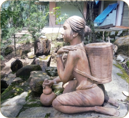 一座农妇跪地舂凿劳作的雕像:戴银颈圈、银手镯背竹篓,神似古山区劳动妇女。几十年前我在广州郊区新滘公社见识过男人在街上抱娃娃喝茶闲逛,女人在骄阳直射下挑满桶大粪接力送田间挥汗如雨的场面,类似状况在缅甸、柬埔寨农村我也多次见到,在越南河仙我也曾看到妇女自行车筐后面满载芒果烈日暴晒下沿街叫卖整日不归家的劳苦,印尼所过城镇农村一样存在,情况似好些。东南亚国家,包括广州在内的这些热带地方为什么会有这样的怪象没搞明白,很为妇女们的沉重体力负担鸣不平。景区这一片像是民俗展演区,一些坐曲径沿路和山坡草地上的中老年妇女身着民族服装摆小摊做针线活,只是游客寥寥,她们自己说笑打发时间,想来节假日里游客多多之际,她们还是会有游客光顾的。景区工作人员时有在小径上下,身穿制服,和民俗表演的农妇们大不相同。