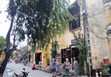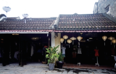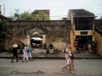 我走进挂有“黎家祠”门匾的临街百年老屋,主人一家人就生活在屋里,上下两层楼,二楼木梯可上,但谢绝参观。一楼客厅书房和主人卧室,夹道板壁分两边。天井院内有树有井,厨房在天井一侧,连同屋檐下石阶摆放各种炊具餐具,给人沧桑古朴、传世家久之感。墙上贴有中文说明,标点少,文体读之拗口,可能是越南文的华文翻译,大体可知祠堂二百年历史和建筑材料与风格形成,集中国、日本、越南之建筑雕刻艺术于一身。天井外墙有门,出去是秋盆河边一条街。一屋跨两街,中有穿堂风,又近河边,炎热夏季是个好住处。一群美国学生坐听讲解,参观完从天井走出到河边休息集合。