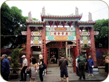 出中华会馆几十米远摄福建会馆。我的套票五附券已使用完,看门的女士看我拿出的光板票笑了笑,挥手放我进去参观。院内同样是天后宫,开阔广场,大鼎,高门楼。主殿供奉天后神像,母仪天下,众星捧月。其中一块碑特别引人注目:“接修拜亭 一心诚敬 千载犹存 许长胜 苏沧州 蔡合荣 仝敬 光绪廿六年庚子季春”,记载了中国人注重诚信,保证质量,为后人造福的基本道德信念。庚子年,1900年,国势衰微,丧权辱国之时,但中国人的高尚道德情操和数千年传统文化教养,是支撑中国人走出危败的精神支柱。今人读之,某些偷工减料建造垃圾建筑,赚昧心黑钱的建筑黑商们,心中可有愧乎?!福建会馆建得大气,金碧辉煌,值得一看。出门时向守门女士致谢。