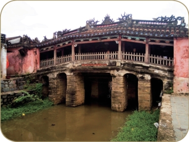 廊桥下窄河里的水汇入会安母亲河——秋盆河。汇流处一道和岸路平齐的木板桥连接两岸,游人往来不息,不断有游人站平桥上拍下岸边风光远摄廊桥。也许刚下过雨的缘故,秋盆河水浑黄,岸边有小块长满野草的淤泥河滩,捕捞网悬在泥滩近处,几条木船停在河中,岸边人行道小贩叫卖碳火烤制的小饼,三轮车夫不断吆喝游客“请坐车游览”。稍远处一道宽桥接连秋盆河对岸,岸那边商铺鳞次栉比,游人穿梭往来,也是热闹去处。