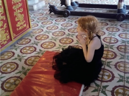从河边绕回“广肇会馆”,门前验票小姐见我笑着说,“一去买票不回,还以为你不会来参观了呢。”我说去桥另一边街上看过,现在人少了才好看啊。广肇会馆牌坊街门,入内,一门庭两进院。门院两边墙上写有孙文体“博爱平等”和“精诚团结”标语,上台阶过门厅,抬头“慈云镜海”横匾,两侧墙上各有“桃园结义”和“千里送嫂”大幅彩画,突显一个“义”字精神。院中方池,蛟龙出水,彩色龙身,九曲盘旋,展现出中华图腾的勃勃雄姿。正殿大堂正中牌位甚多,总牌位书写“历代乡亲列位先友之神位”,其下梁黎张王黄欧阳邓罗吴程翁诸姓人家先祖牌位。两侧有关公神位和义祠堂,各有台案供奉。两侧壁挂有招财进宝、福寿康宁、八仙过海、麻姑献寿、道家吉祥的画作和三顾茅庐的三国故事画。一个学龄前外国小妮儿合掌跪在诸神牌位前,不知小小心灵里在祈愿什么,为家人?为自己?童心所至,令人怜爱有加。