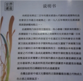 1999年联合国教科文组织将会安古城作为文化遗产,列入《世界遗产名录》。整座会安城分为五个区,按照中国不同地区划分,有福建帮、广东帮、潮州帮、海南帮和客家帮。建有福建会馆、广肇会馆、潮州会馆、琼府会馆和作为五帮会馆的中华会馆。会馆建筑雄伟壮丽,金碧辉煌,分别供奉妈祖、关公、伏波将军等,终年香烟缭绕。城内除大部分为中国式建筑外,还有为数不少的法式古典建筑和庭院式建筑群,大多外形美观、线条优美,外墙则装饰欧洲文艺复兴时期人物塑像,颇具艺术价值。城内还有不少有越南民族特色的优美建筑。日本廊桥是城内著名建筑,修建于1593~1595年,1593为猴年,1595年为狗年,故西桥头有狗石雕像,东桥头是猴石雕像。