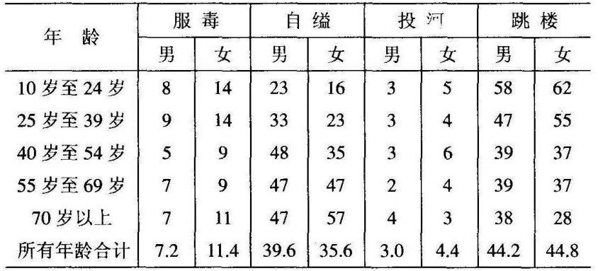 注:数字为每一性别中以该方式自杀的百分率,由于尚有其他方式自杀的,所以百分率总和不一定是100%。