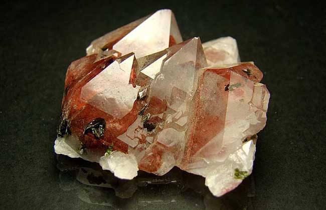 纯净时形成无色透明的晶体。当含微量元素Al、Fe等时呈粉色、紫色、黄色,茶色等。经辐照微量元素形成不同类型的色心,产生不同的颜色,如紫色、黄色、茶色,粉色等。含伴生包裹体矿物的被称之为包裹体水晶,如发晶、绿幽灵、红兔毛等,内包物为金红石、电气石、阳起石、云母,绿泥石等。