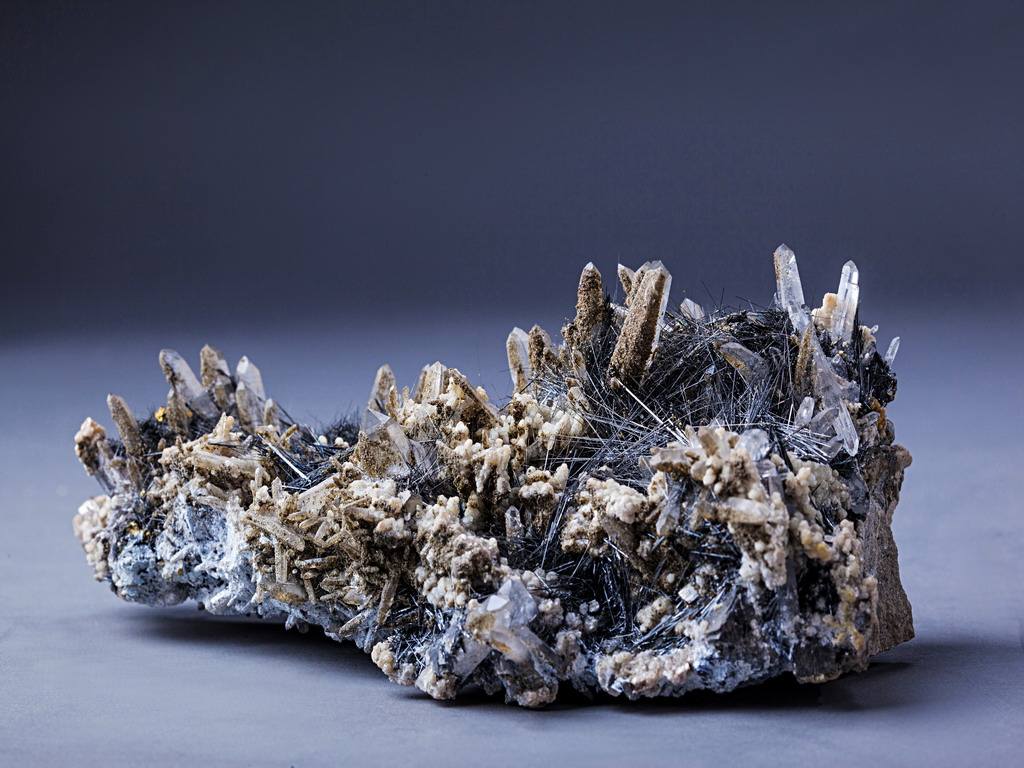 辉铋矿晶体属正交(斜方)晶系的硫化物矿物。铋含量占81.3%,是提炼铋的最主要矿物原料。辉铋矿呈微带铅灰色的锡白色,金属光泽。摩斯硬度2~2.5,比重6.8。晶体呈长柱状或针状,集合体呈放射柱状或致密粒状。