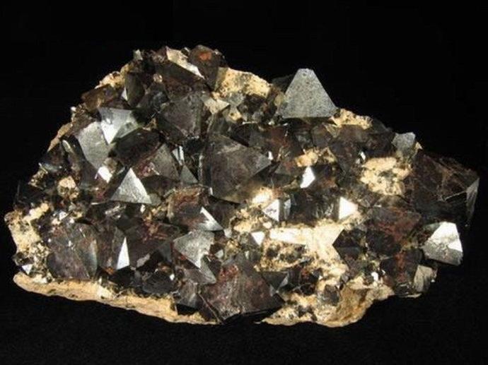 磁铁矿的主要成分为Fe3O4,晶体属等轴晶系的氧化物矿物,晶体常呈八面体和菱形十二面体、集合体呈粒状或块状。完好单晶形呈八面体或菱形十二面体,呈菱形十二面体时,菱形面上常有平行该晶面长对角线方向的条纹。集合体为致密块状或粒状。