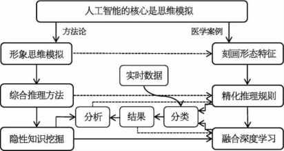 图3-3 重视经验的思维模拟方法论。钱学森先生指出思维模拟的瓶颈在于形象思维模拟,潘云鹤院士就此提出综合推理方法,笔者认为,就具体问题而言,其中关键问题是隐性知识的挖掘。以计算机辅助心血管疾病分析为例,医生诊断思维过程所涉及的形态特征十分重要但往往被忽视;在此基础上,通过分析错误的分类结果、与医生交流对现有的诊断规则做精化以涵盖细节、完善全貌;而隐性知识的挖掘仅此还不够,要与机器学习,特别是深度学习相融合。最后的分类器,实际上是包含诸多针对特定任务的子分类器的集合。符合临床要求的分类结果数据可供后续学习。图中实线表示深化或递进过程,虚线表示对应关系或可能的影响