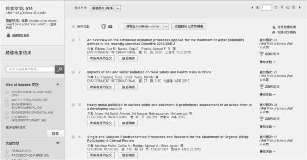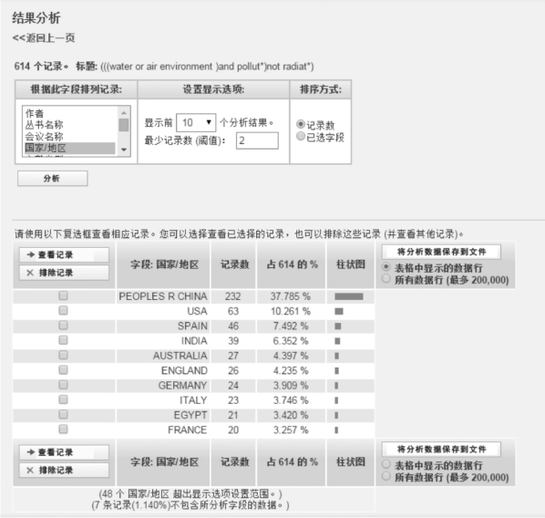 输入系统进行检索,得到检索结果614条(如图5-12所示),将这614条结果按照国家/地区进行分析,可知该领域研究最多的国家是中国和美国(如图5-13所示)。