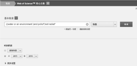 根据课题可知检索内容为“非辐射环境污染”,故检索中不含“辐射”(radiation),而含有“环境污染”(environmental pollution),另外“环境”还可以扩展为water、air、environment,“污染”可以扩展为pollutant、pollute。考虑英语词汇的变化形式,可以进一步采用通配符pollut*、radiat*。构造的检索式为:((water or air or environment)and pollut*)not radiat*。由于该课题涉及的检索词较多,逻辑关系比较复杂,所以考虑选择题名(Title)作为检索入口。时间选择2015—2016年,检索界面如图5-11所示。