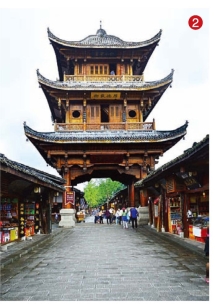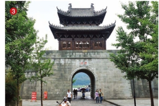 先看看今日阆中古城里的街景。几十条纵横交错的街道,平整的青石板路,路的两边是比肩林立的店铺,店铺里摆放着琳琅满目的商品,招牌、旗幡、广告接踵而至……据说每天还有古装“张飞”乘坐马车带队巡街。古城中,能够让我们留下印象的,还是城楼(图2、图3)。