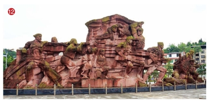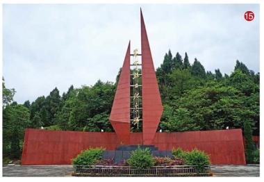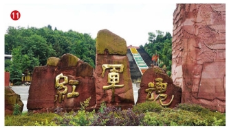阆中红军纪念园以“红军魂”命名(图11),位于与阆中古城隔江相望的黄花山脚下,始建于1991年,扩建于2009年至2010年,现占地上百亩,已成为川北地区规模最大的红军主体纪念区和爱国主义教育基地,展现红四方面军创建苏区、渡江长征的壮丽史诗。整个纪念园分为渡江纪念区、星火燎原区、瞻仰仪式区、展馆展览区、军事体验区、英烈园等“五区一园”。园中有4组红砂岩巨型雕塑。