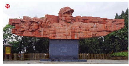登上百多级台阶后来到高台上,园中4组红色巨型雕塑之一的《告别苏区》主题雕塑呈现眼前(图14),寓意当年红军北上离去。基座上的说明文字“告别苏区——红四方面军长征出发地纪念雕塑”记载如下:1932年3月,红四方面军进军川北,逐步创建了全国第二大苏区——川陕革命根据地。1935年3月底,红四方面军主力从嘉陵江阆中——苍溪段成功强渡,随后开始长征。阆中是红四方面军长征主要出发地之一。《告别苏区》雕塑高7.79米,长17.79米,展现了红军战士斩断铁链、翻身革命的铮铮铁骨和告别川陕苏区、踏上长征道路的豪迈气概。