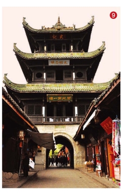 在古城里的最高建筑是华光楼(又名南楼,镇江楼)(图9),该楼为过街楼,楼身建于5米高的石砌台基上,通高36米,三重檐歇山式屋顶,具有唐风清韵,被誉为“阆苑第一楼”,是古城的标志性建筑。