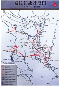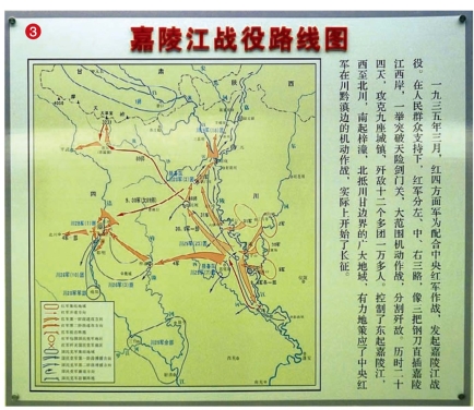在《嘉陵江战役路线图》(图3、图4)中我们可以看出:1935年3月,红四方面军为了配合中央红军作战,发起嘉陵江战役。在人民群众支持下,红军分为左、中、右3路,像3把钢刀直捣嘉陵江西岸,一举突破天险剑门关,大范围机动作战。分割歼敌。历时24天,攻克9座城镇,歼敌12个团1万多人。控制了东起嘉陵江、西至北川、南起梓潼、北抵陕甘边界的广大地域,有力地策应了中央红军在川黔滇边的机动作战,实际上此时红四方面军长征已经开始了。
