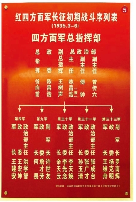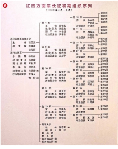 在川主寺红军长征纪念馆里展示渡江后的红四方面军组织序列图比较详细(但也有些差错)(图6)。