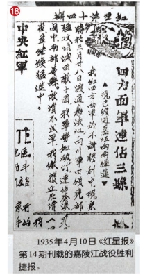 长征途中的中央红军得知红四方面军的胜利,《红星报》于1935年4月10日第14期刊载了嘉陵江战役胜利的捷报(图18)。