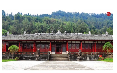 位于旺苍县木门镇南面半山腰的木门寺(图19),距县城38公里。木门寺建于南北朝时期南梁,隋毁,唐代重修。四周大树参天、翠竹葱茏、青幽深邃,青龙寨雄踞其后,金鱼河蜿蜒于下。红四方面军西进撤离广元后,木门寺曾遭到川军的严重破坏。1984年3月,旺苍县政府做出决定,将木门寺列为革命文物保持单位,并进行维修。修葺一新的木门寺,门前一对石狮,大门上有徐向前亲笔题写的“木门会议会址”六个大字,正殿5间,陈列有当年红军留下的革命文物,正殿大门上挂有徐向前、李先念的题词。徐向前1980年的题词是:“继承革命先烈们艰苦奋斗、克服困难的精神和英勇牺牲献出自己宝贵生命的大无畏气概。”李先念1985年5月的题词是:“继承和发扬红军光荣传统,把革命老根据地建设好。”