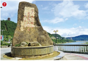 我们在城区里拐来拐去的,来到城边、江边,看见路边的一座圆形基座的石碑(图7),一面刻着徐向前的题字“发扬长征精神建设强大祖国”,另一面刻着朱德题字“革命到底”,就来到“红军渡·西武当山”景区的大门前了。