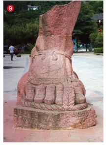 进入景区大门,最先看见的红砂岩雕塑是一只穿草鞋的粗壮的右脚,寓意红军迈着坚定的步伐开始长征(图9)。